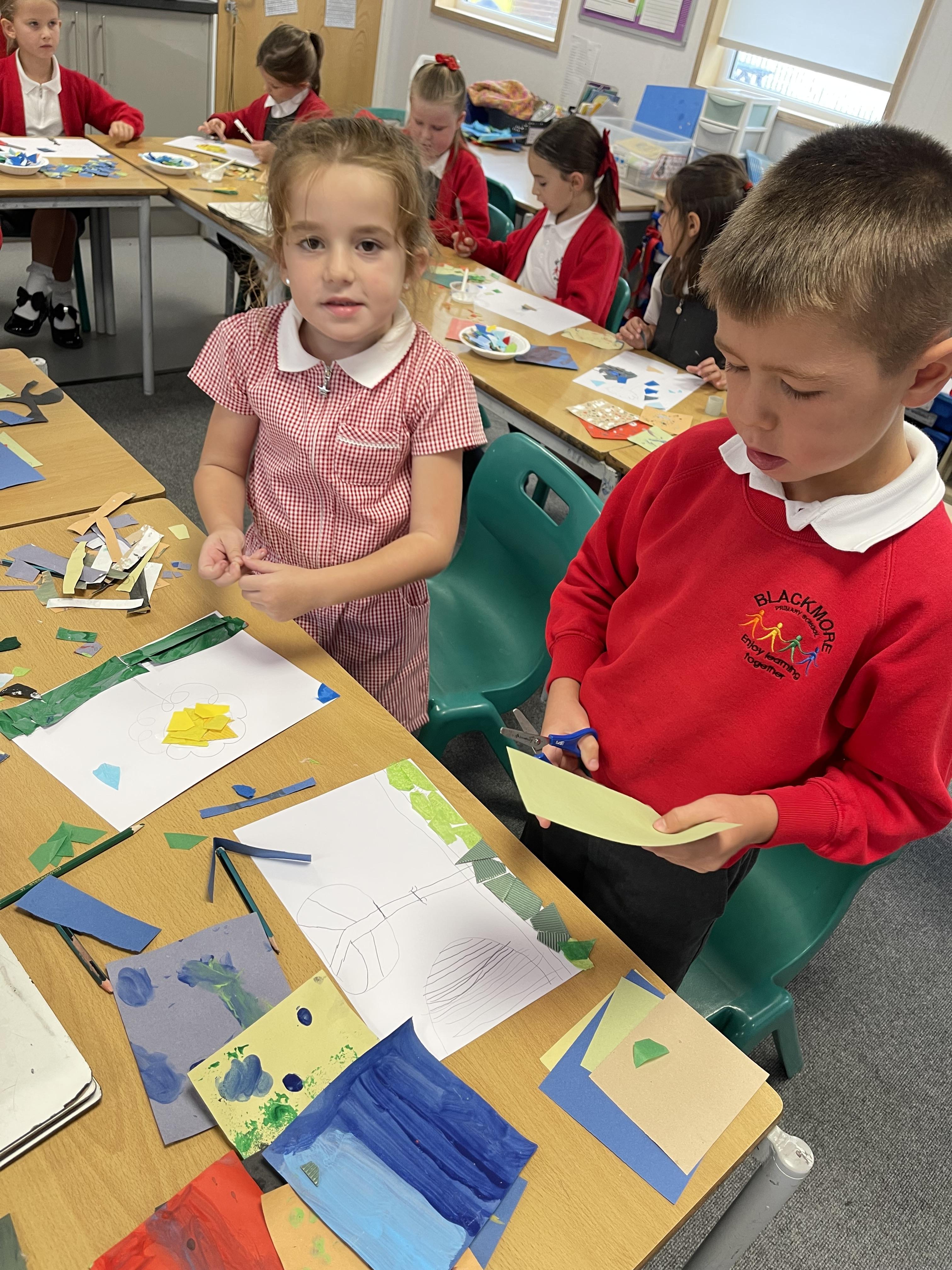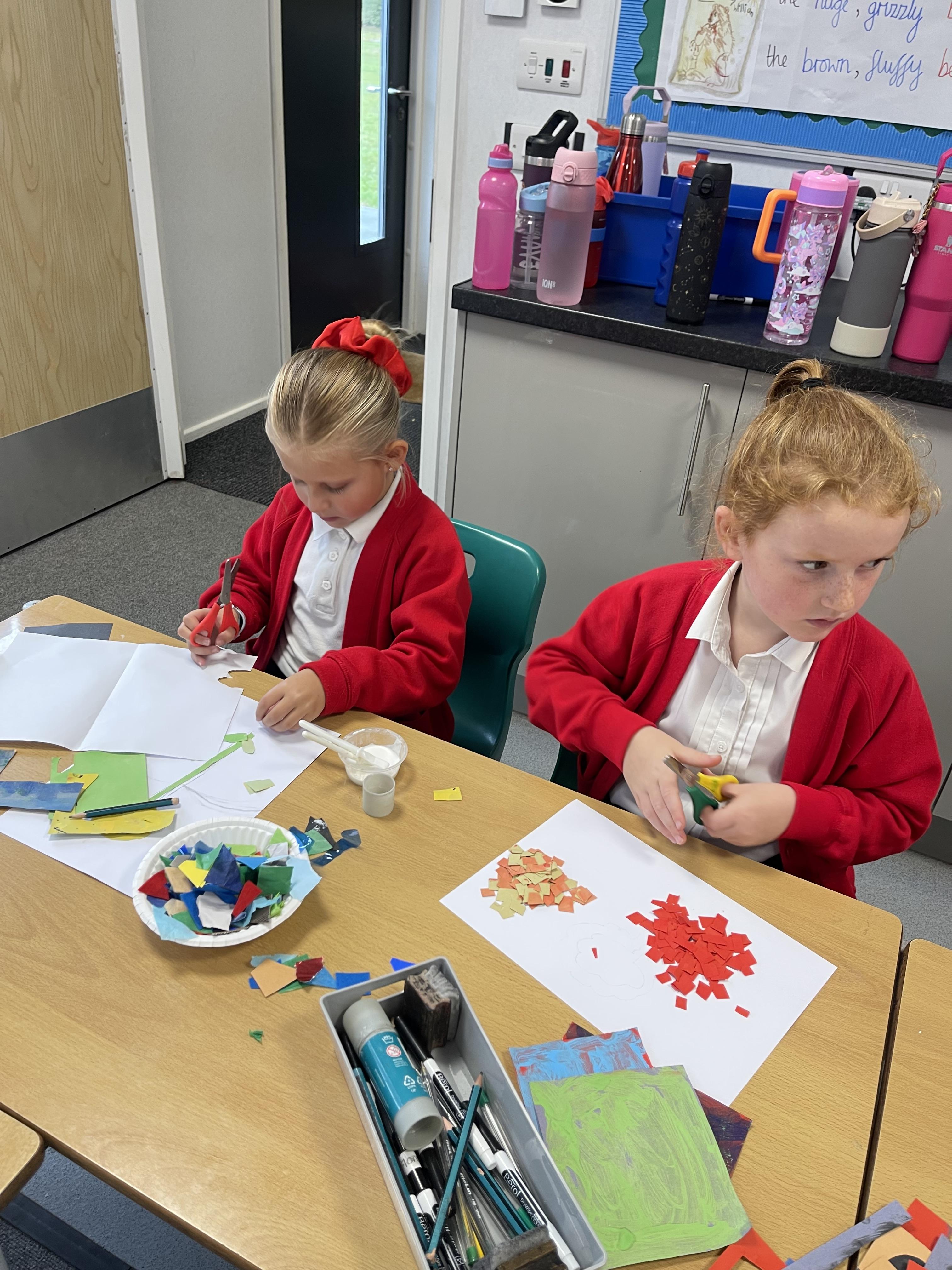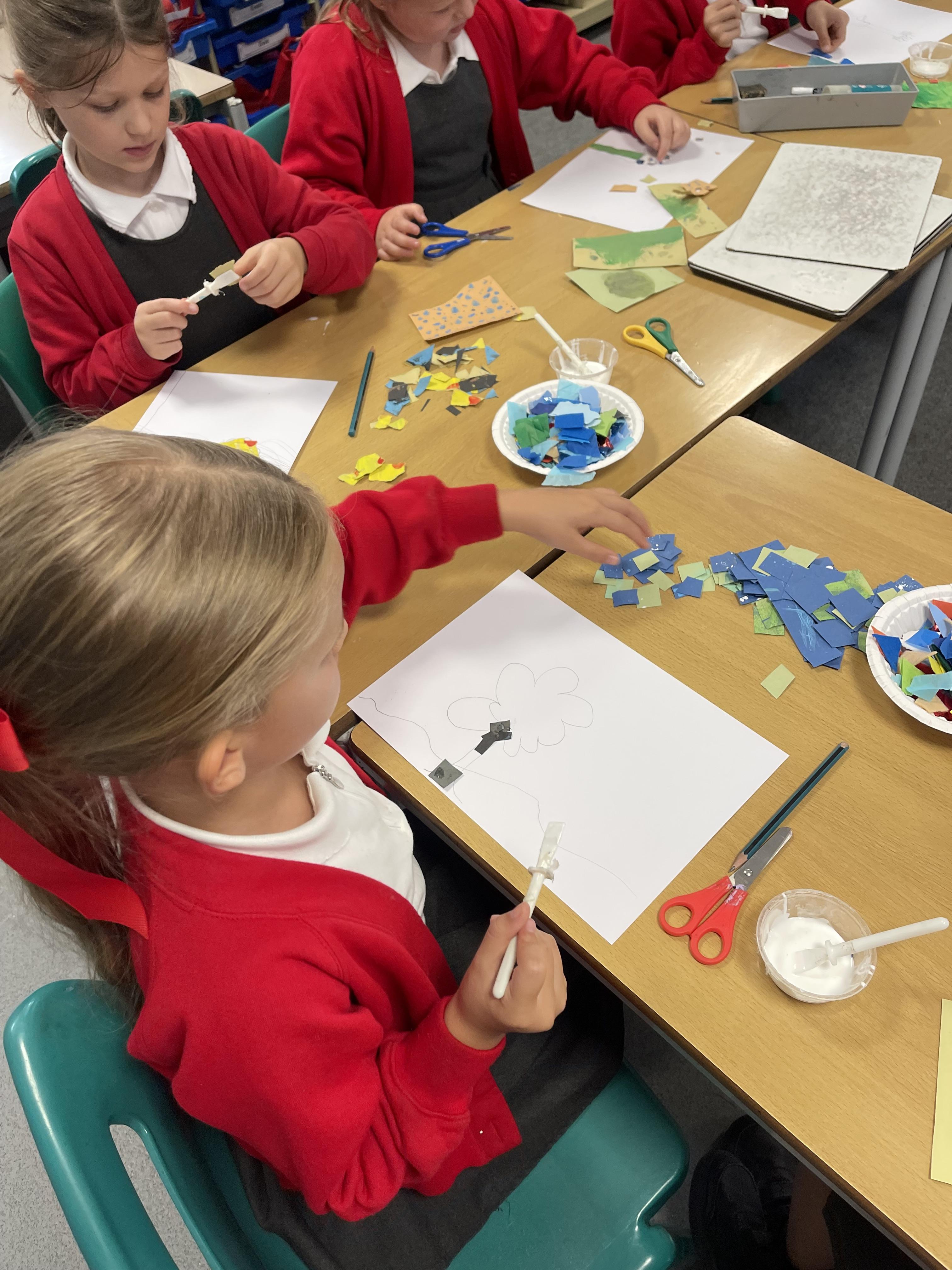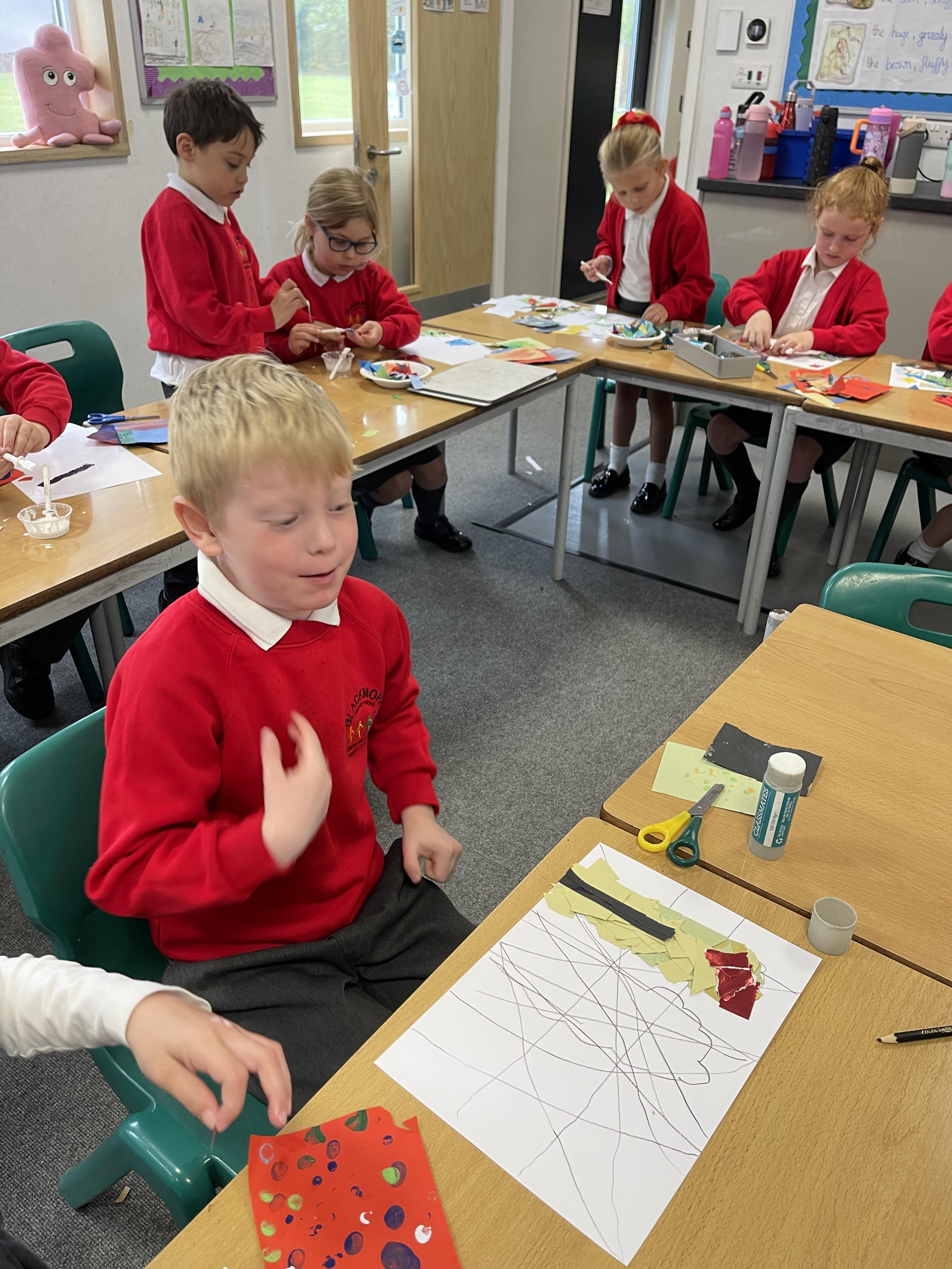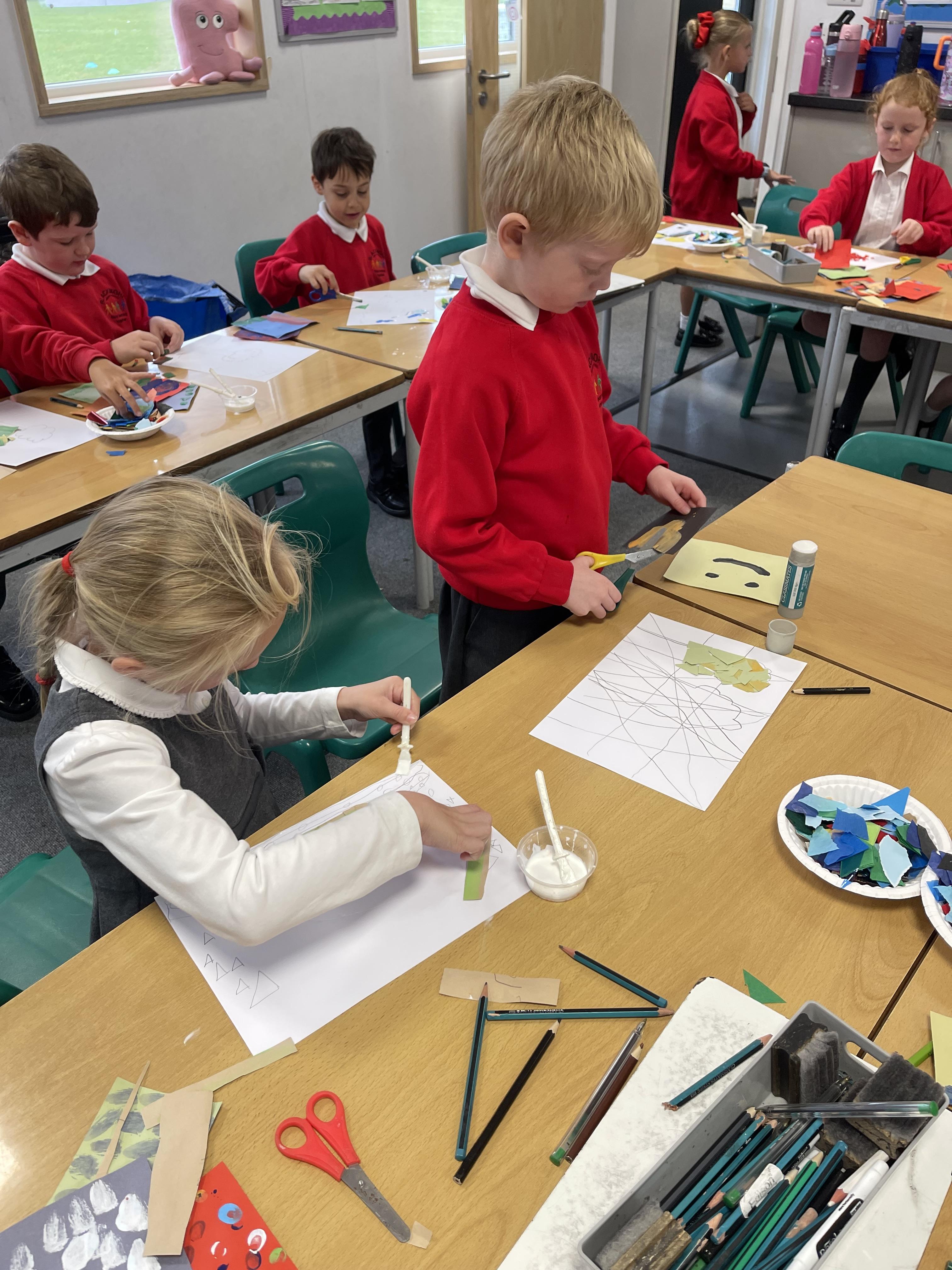Class 2 worked really hard this afternoon, using their imaginations to turn spillages and rips in paper into beautiful art work!