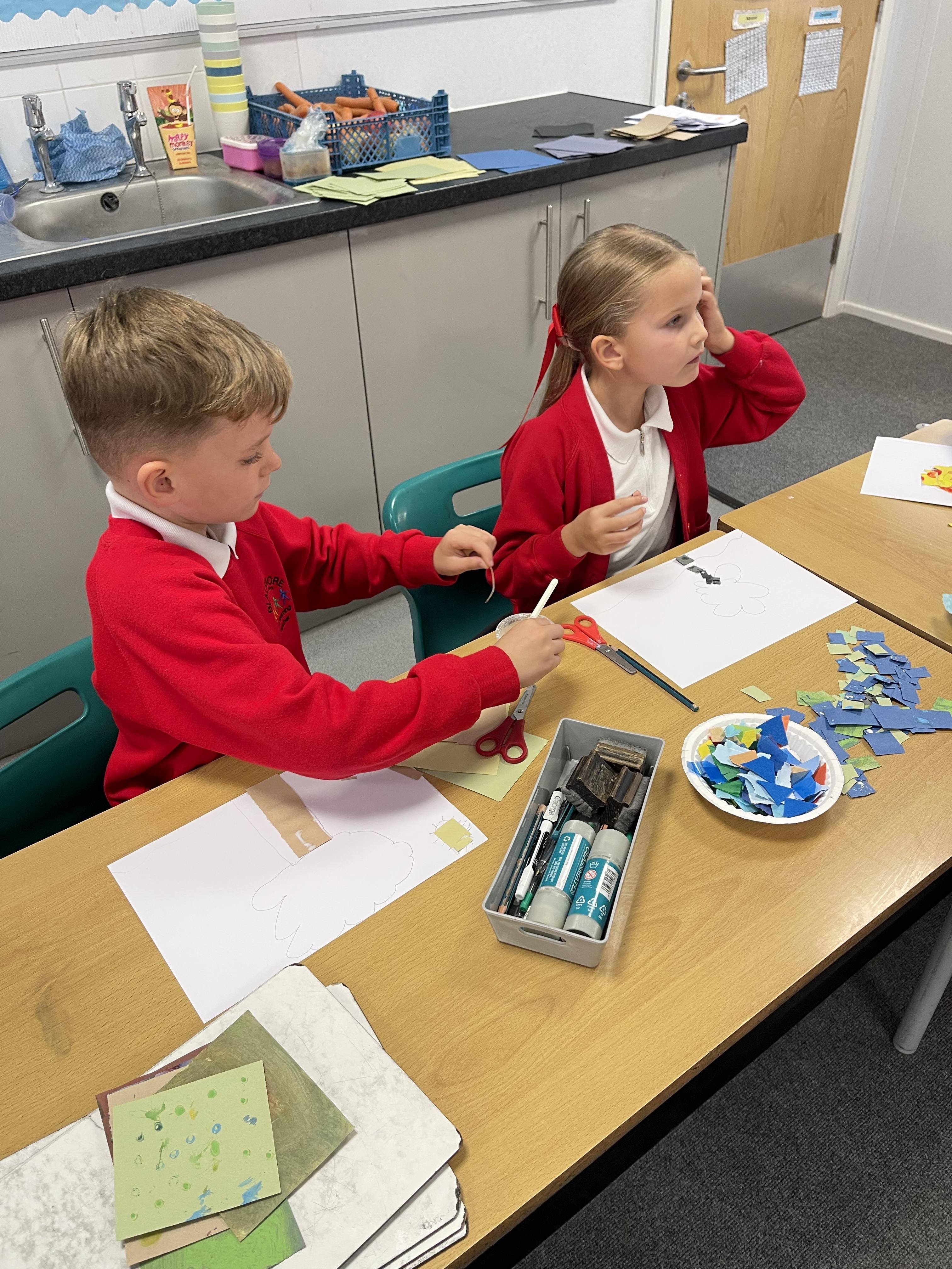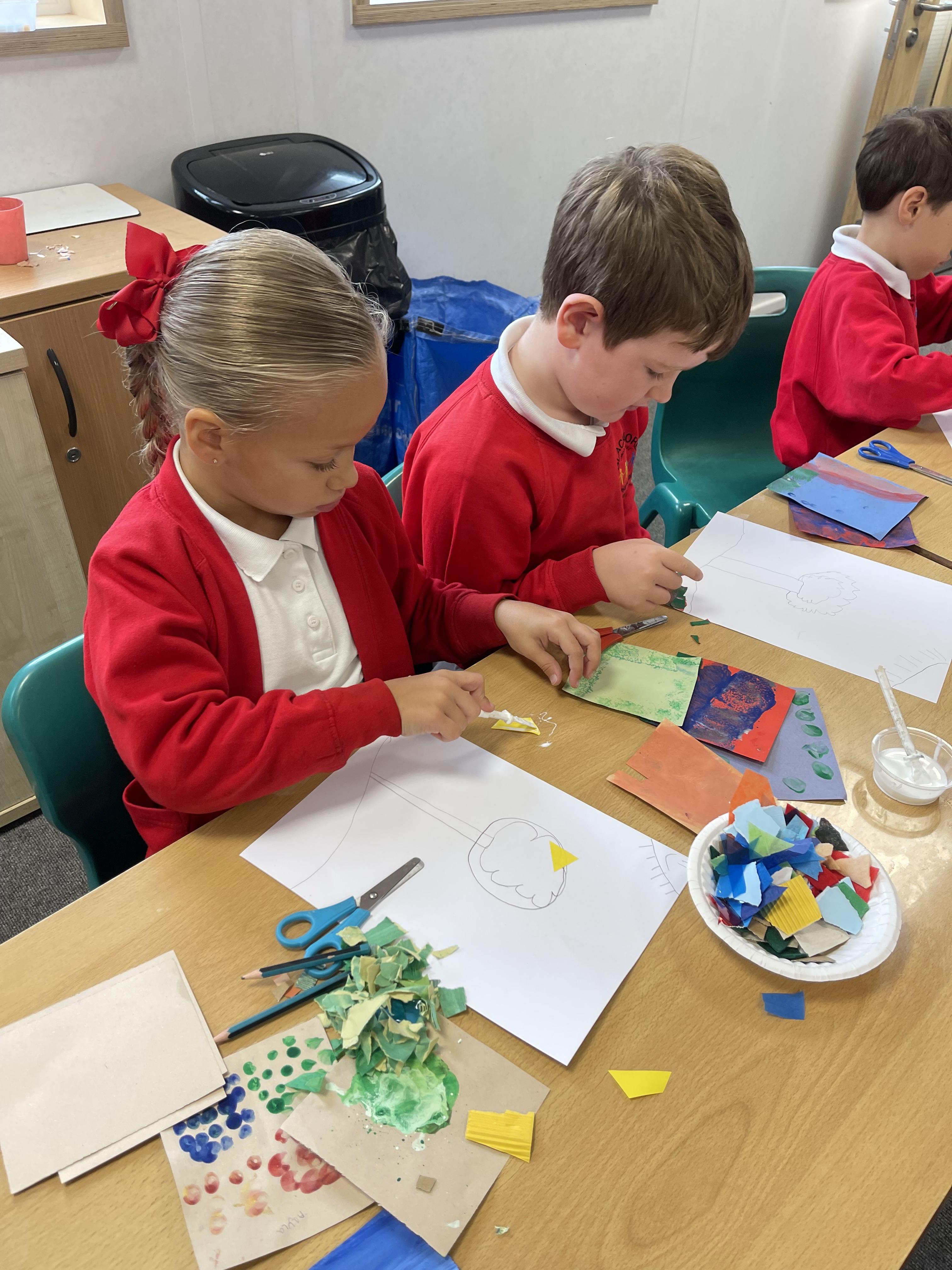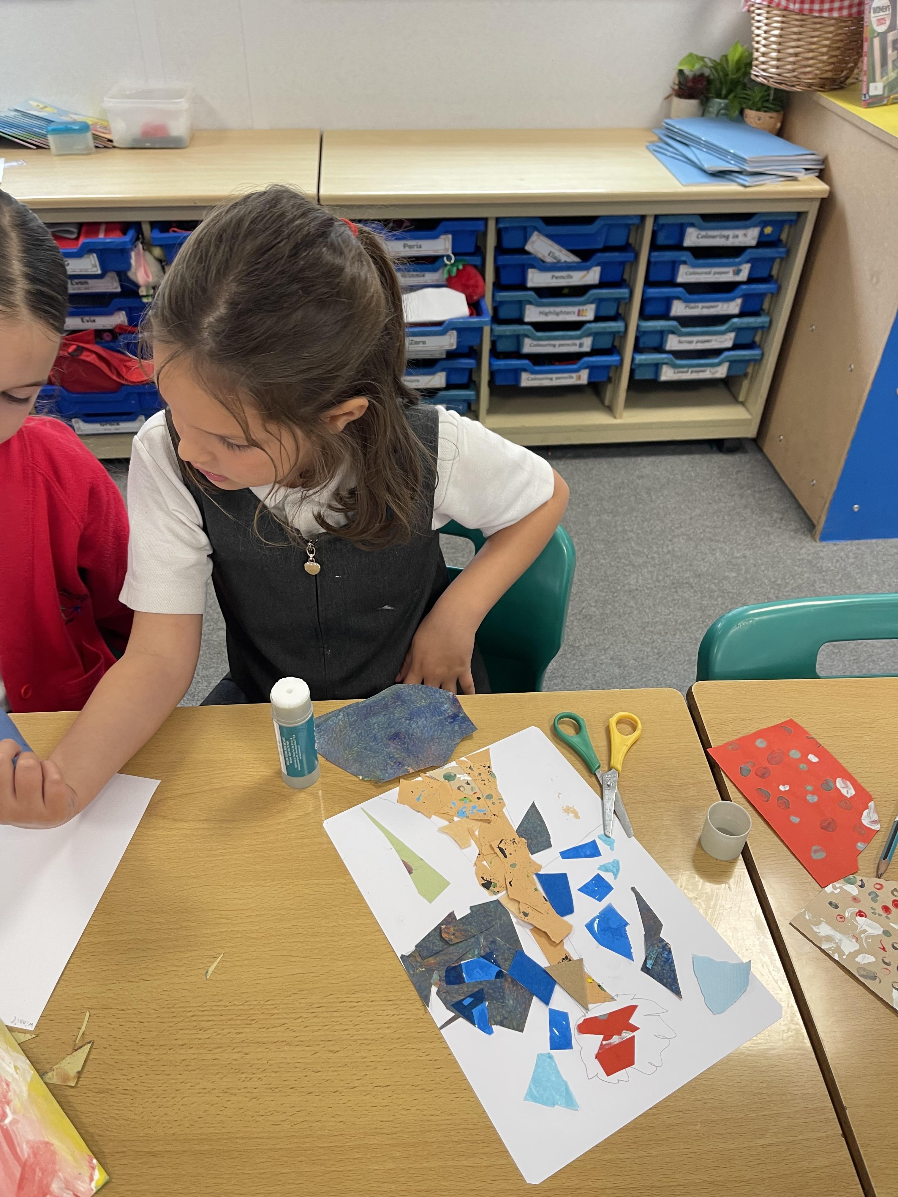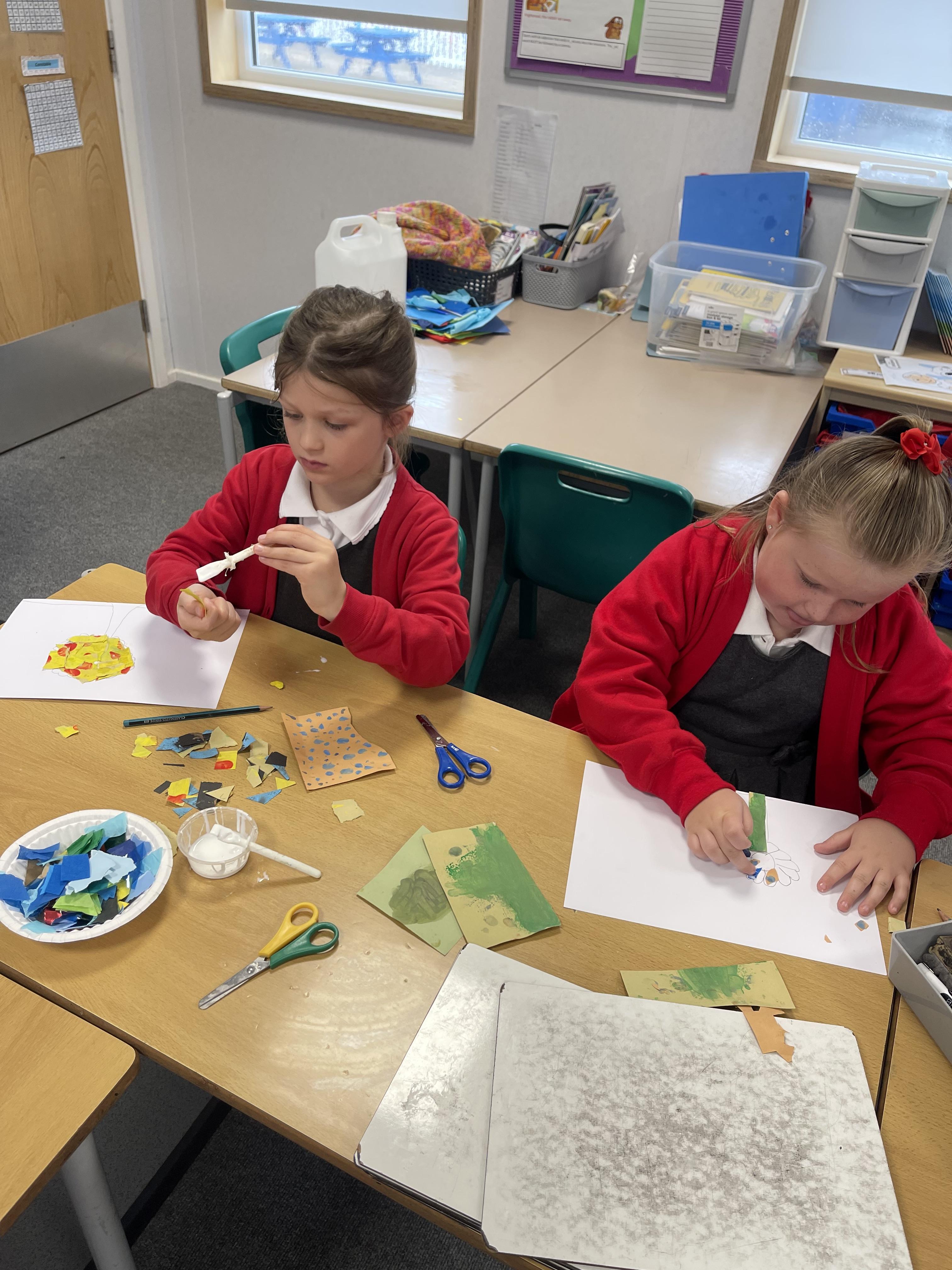 Class 2 worked really hard this afternoon, using their imaginations to turn spillages and rips in paper into beautiful art work!