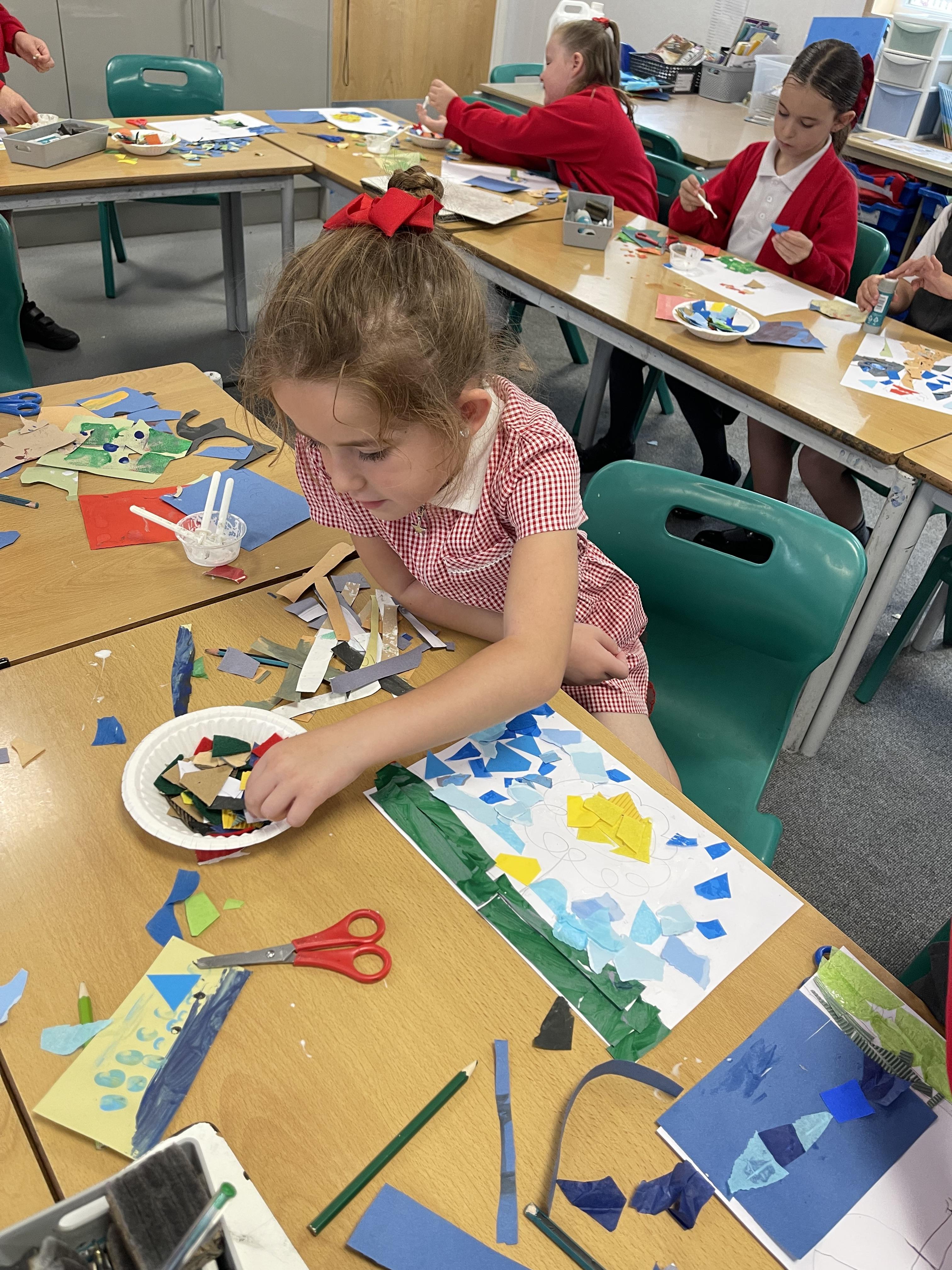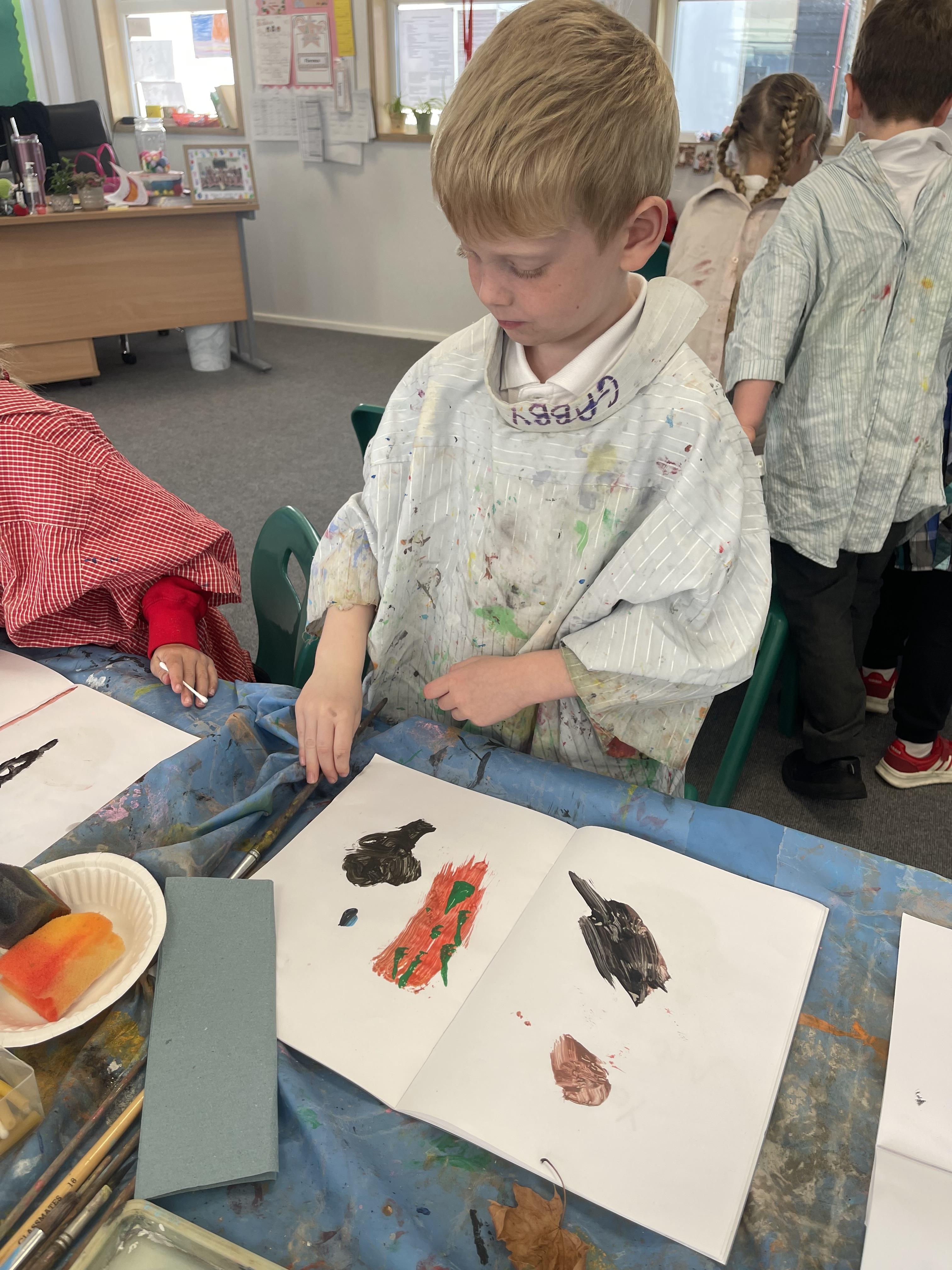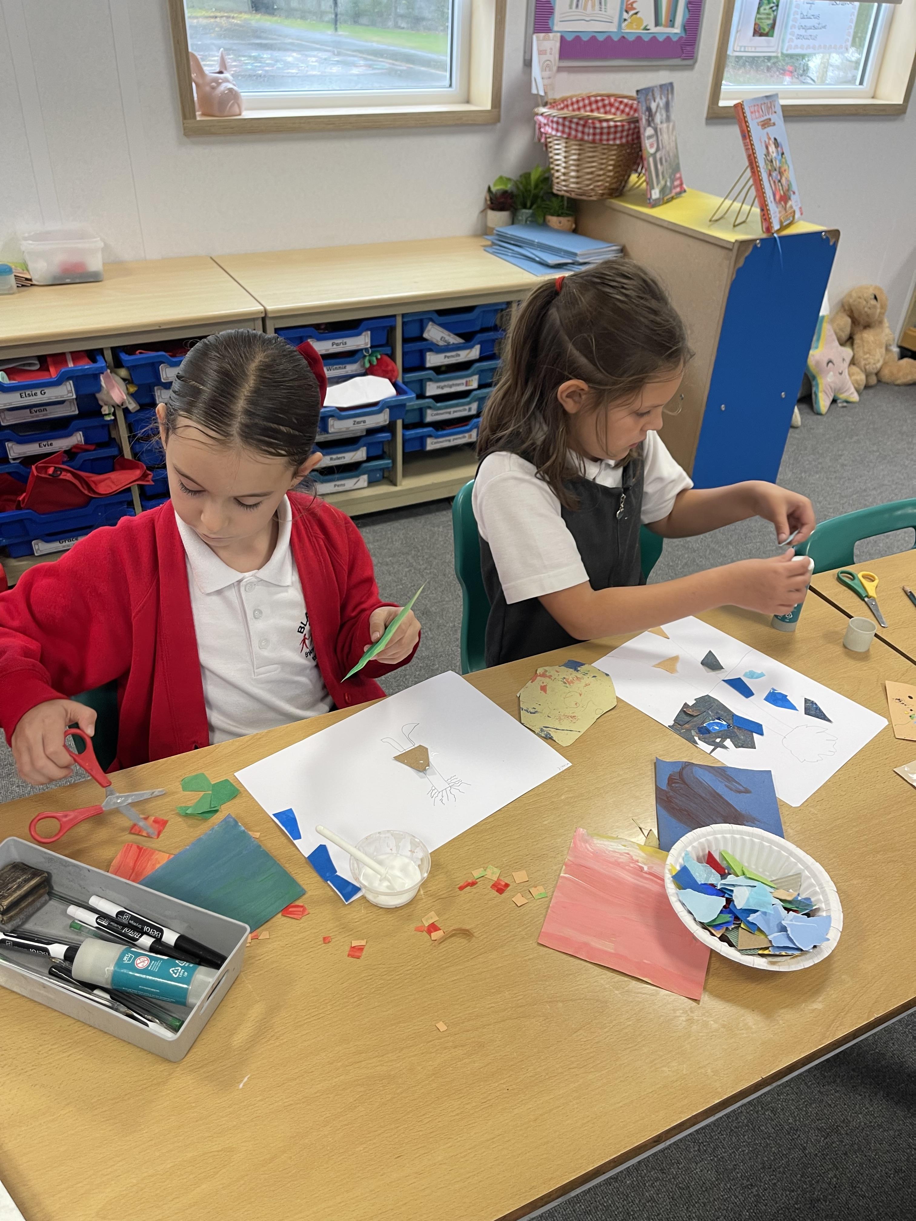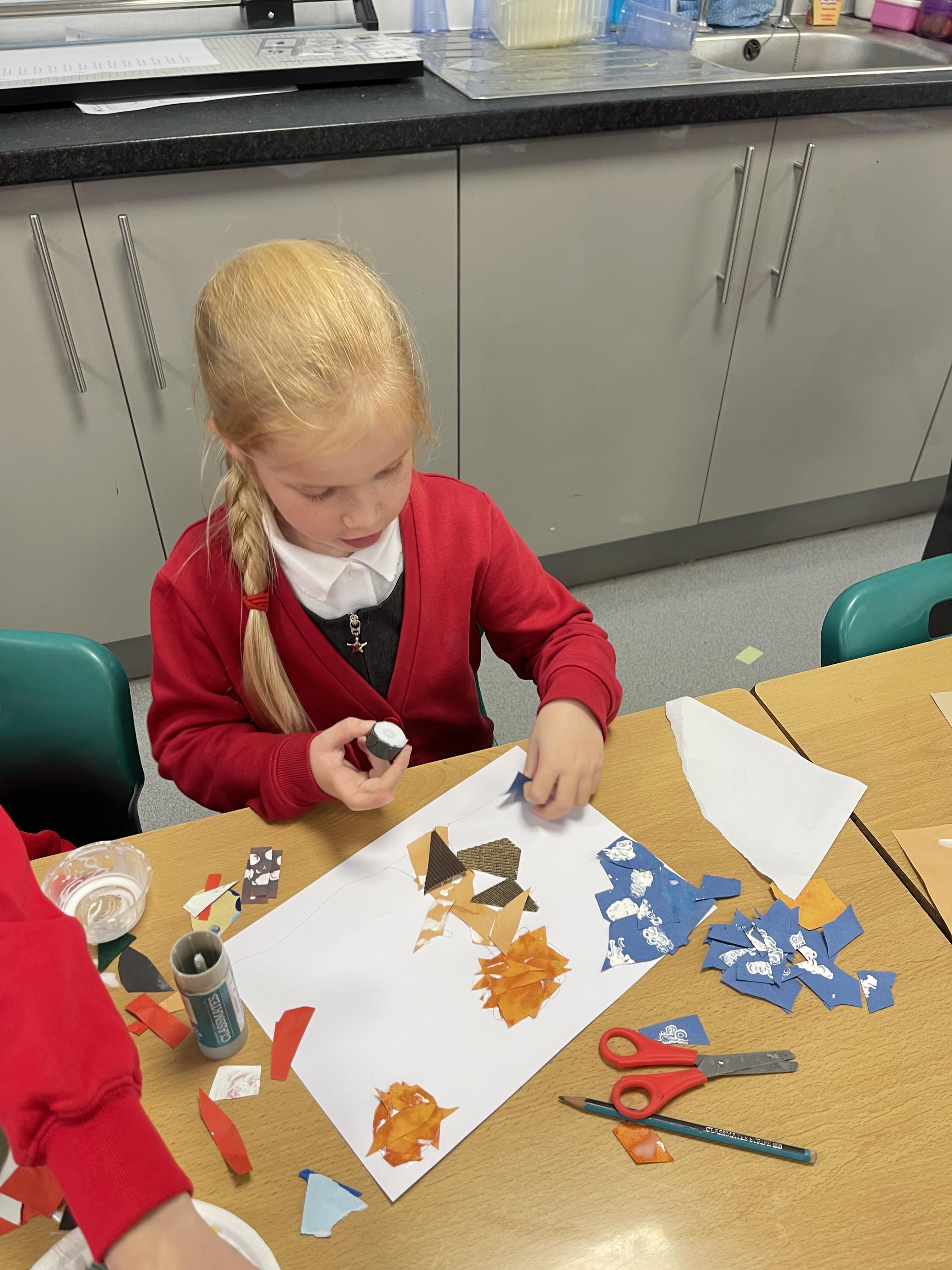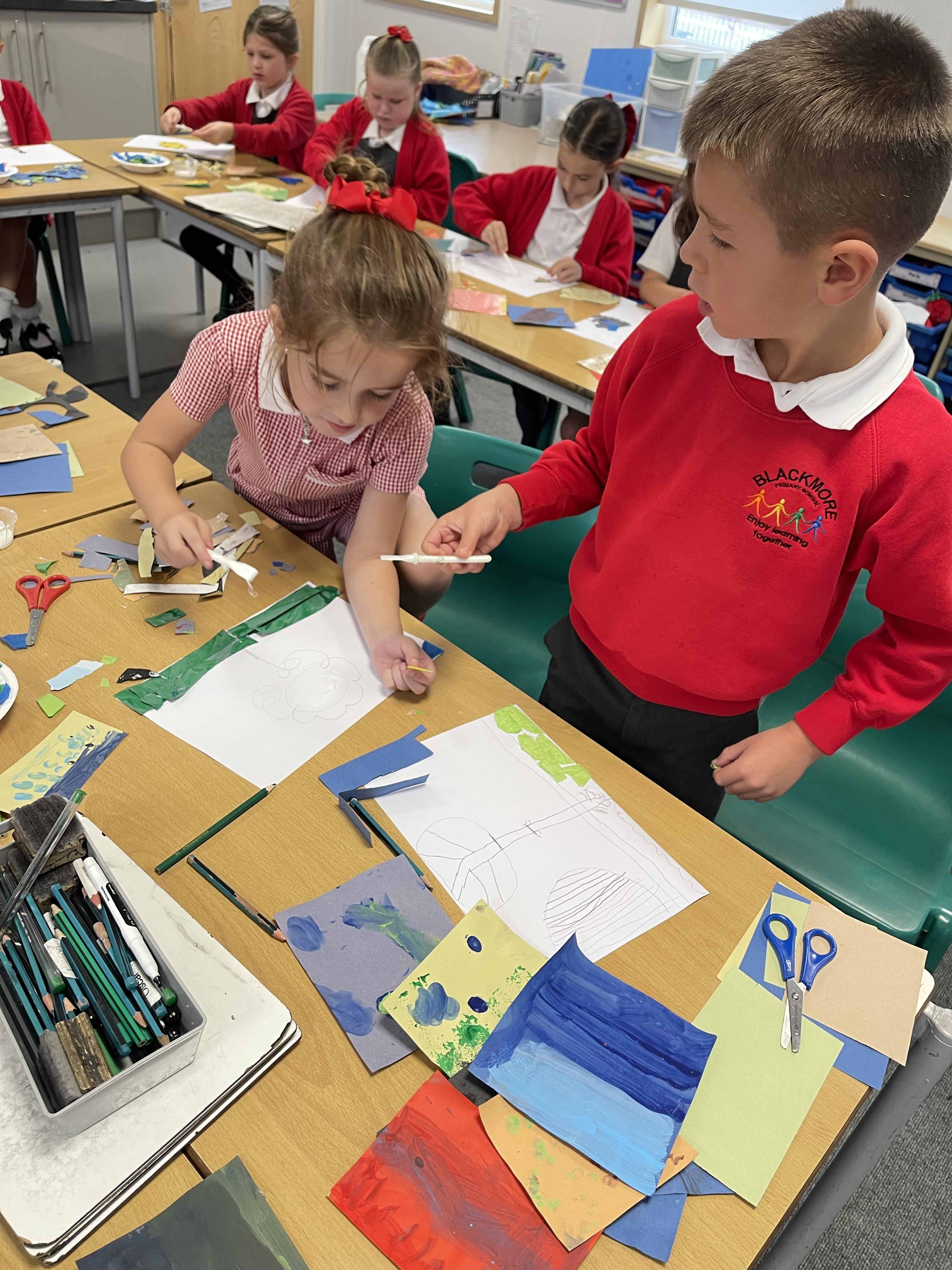 Class 2 worked really hard this afternoon, using their imaginations to turn spillages and rips in paper into beautiful art work!