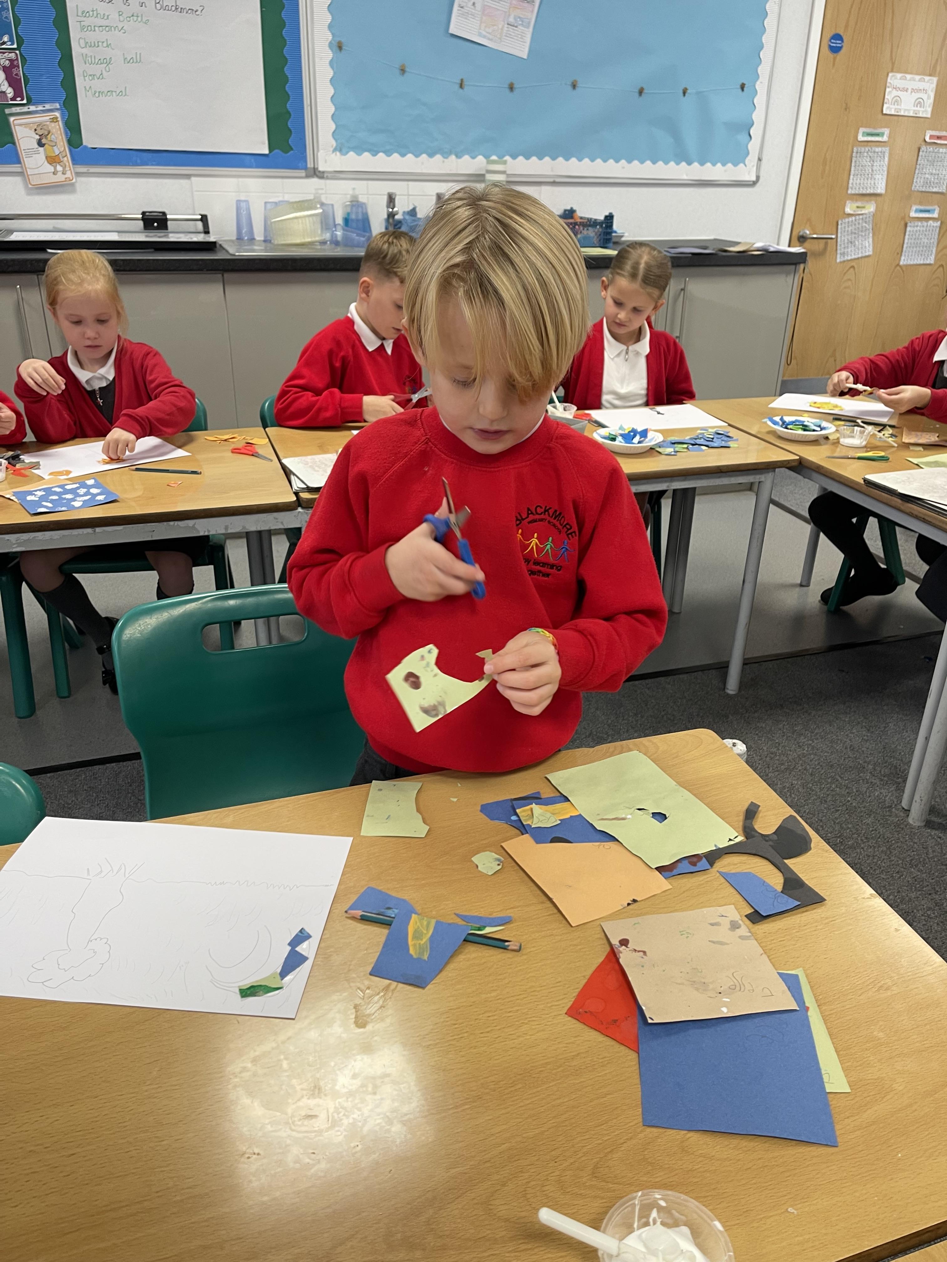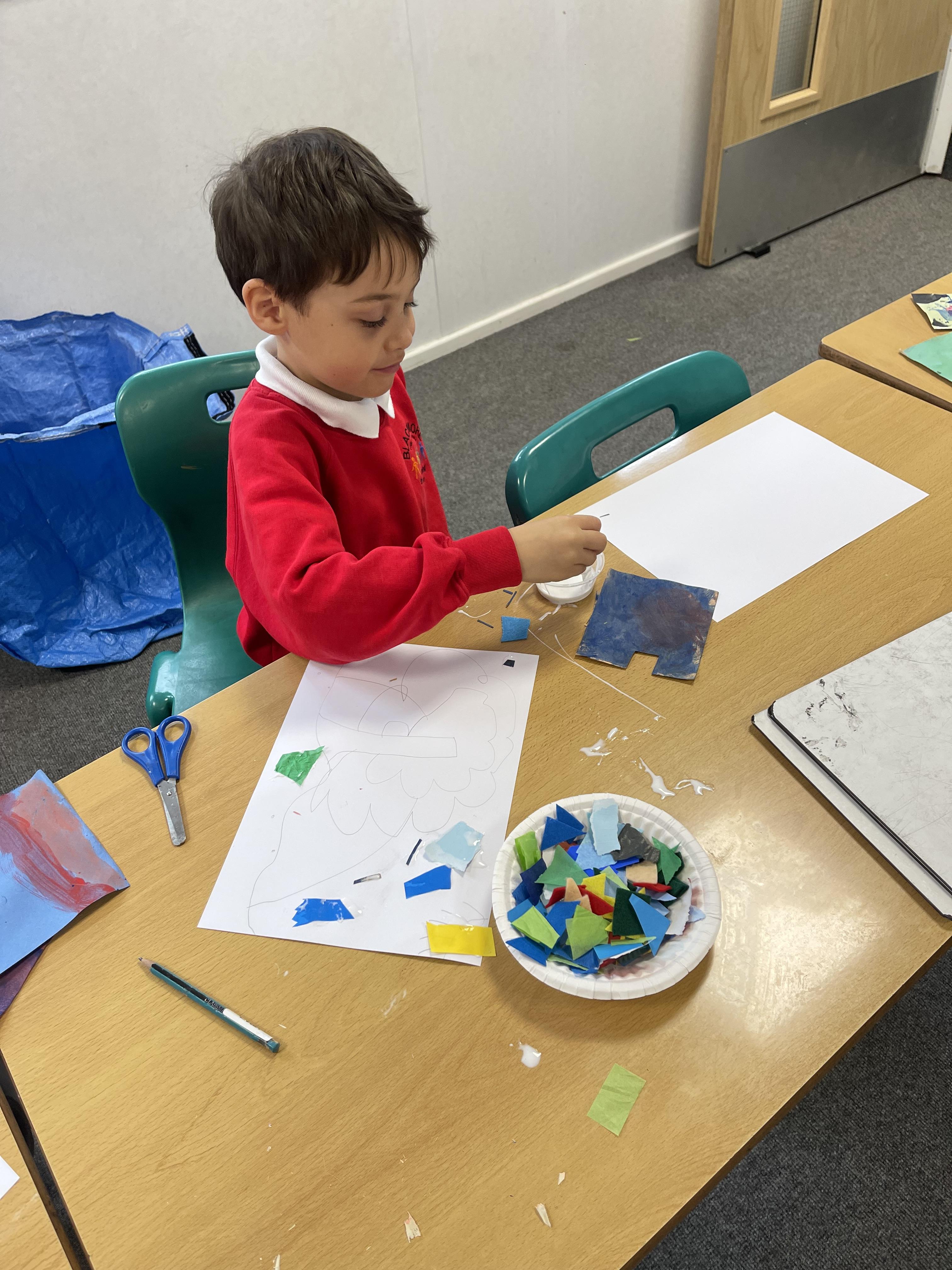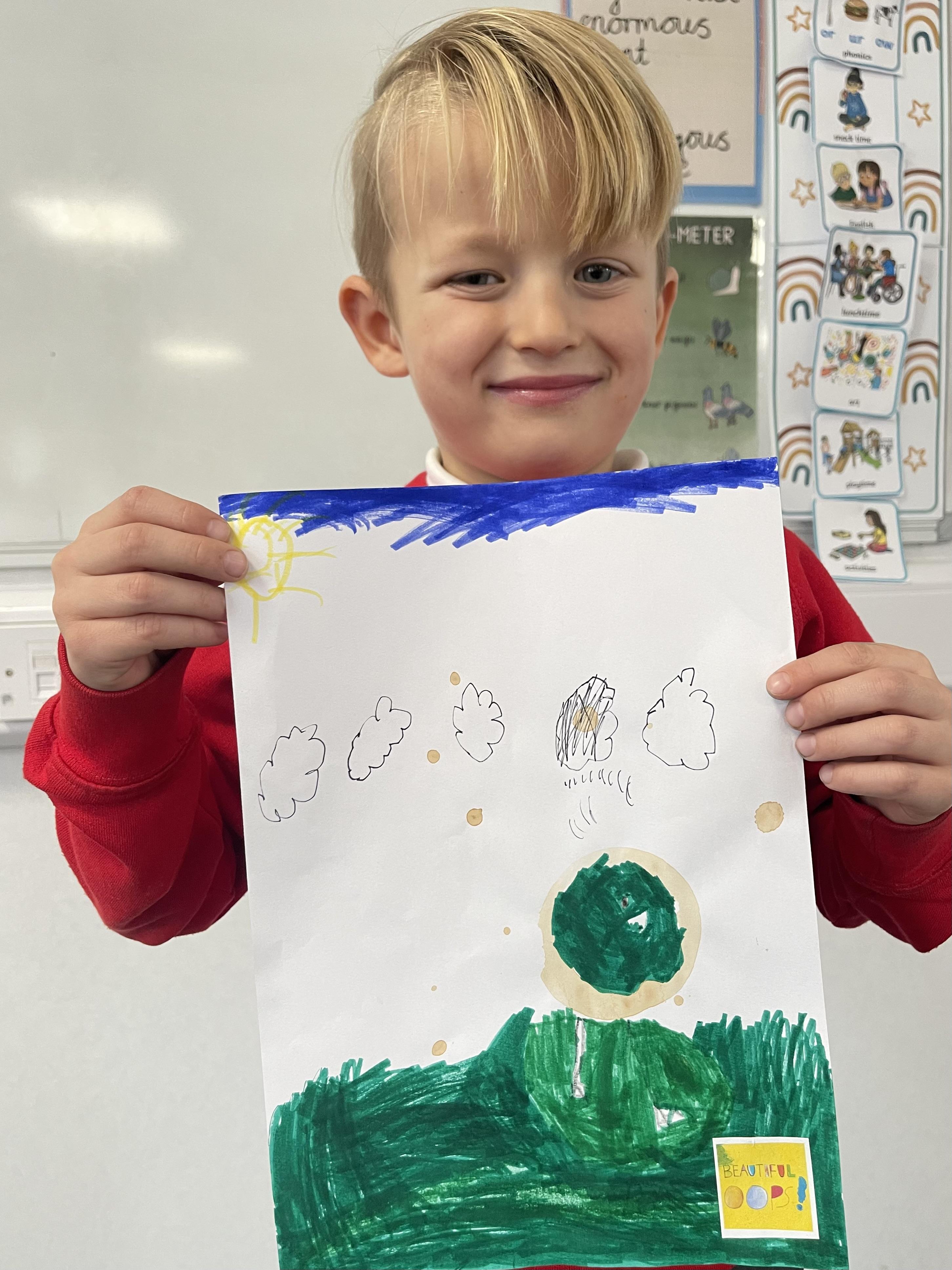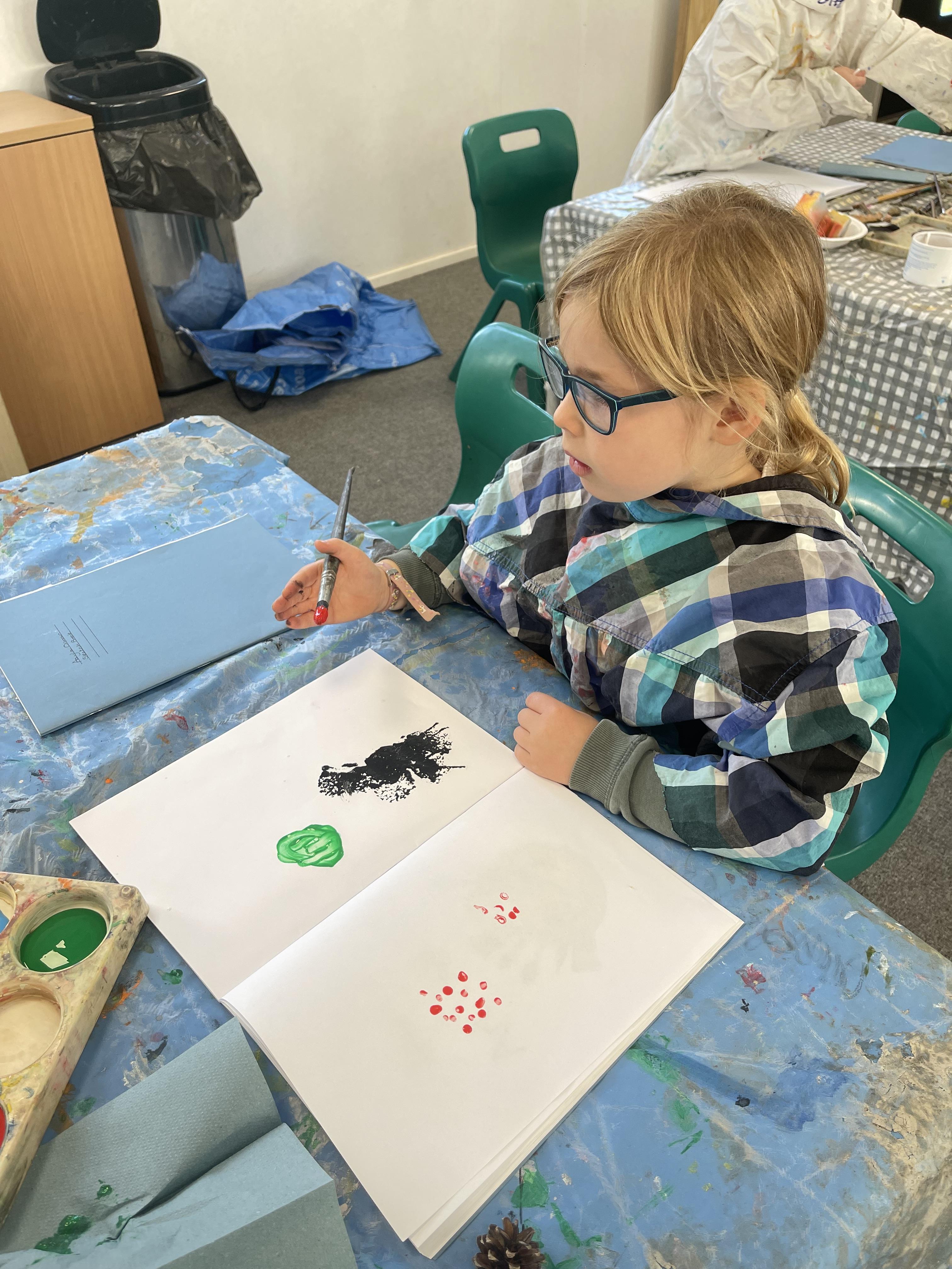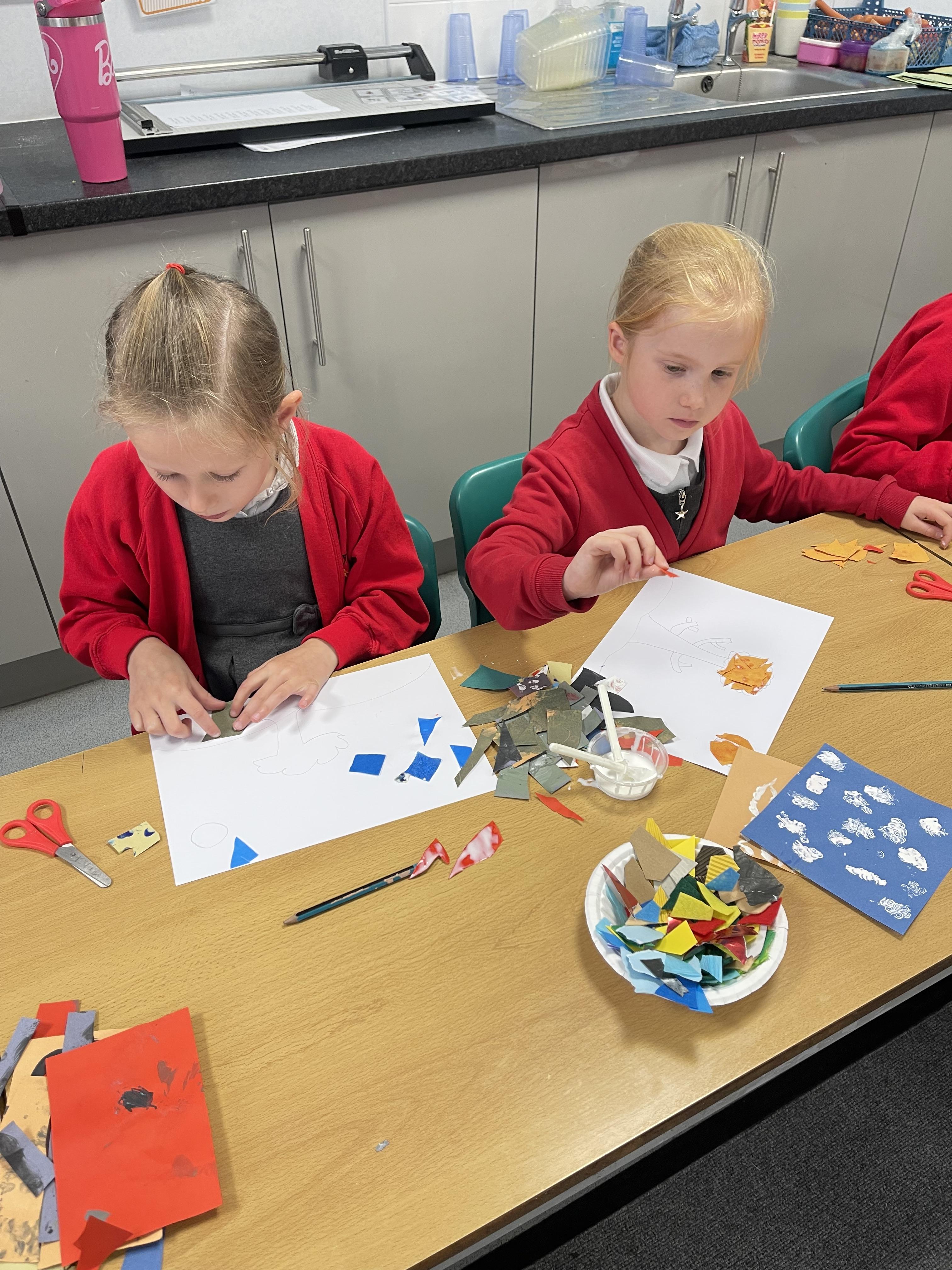 Class 2 worked really hard this afternoon, using their imaginations to turn spillages and rips in paper into beautiful art work!