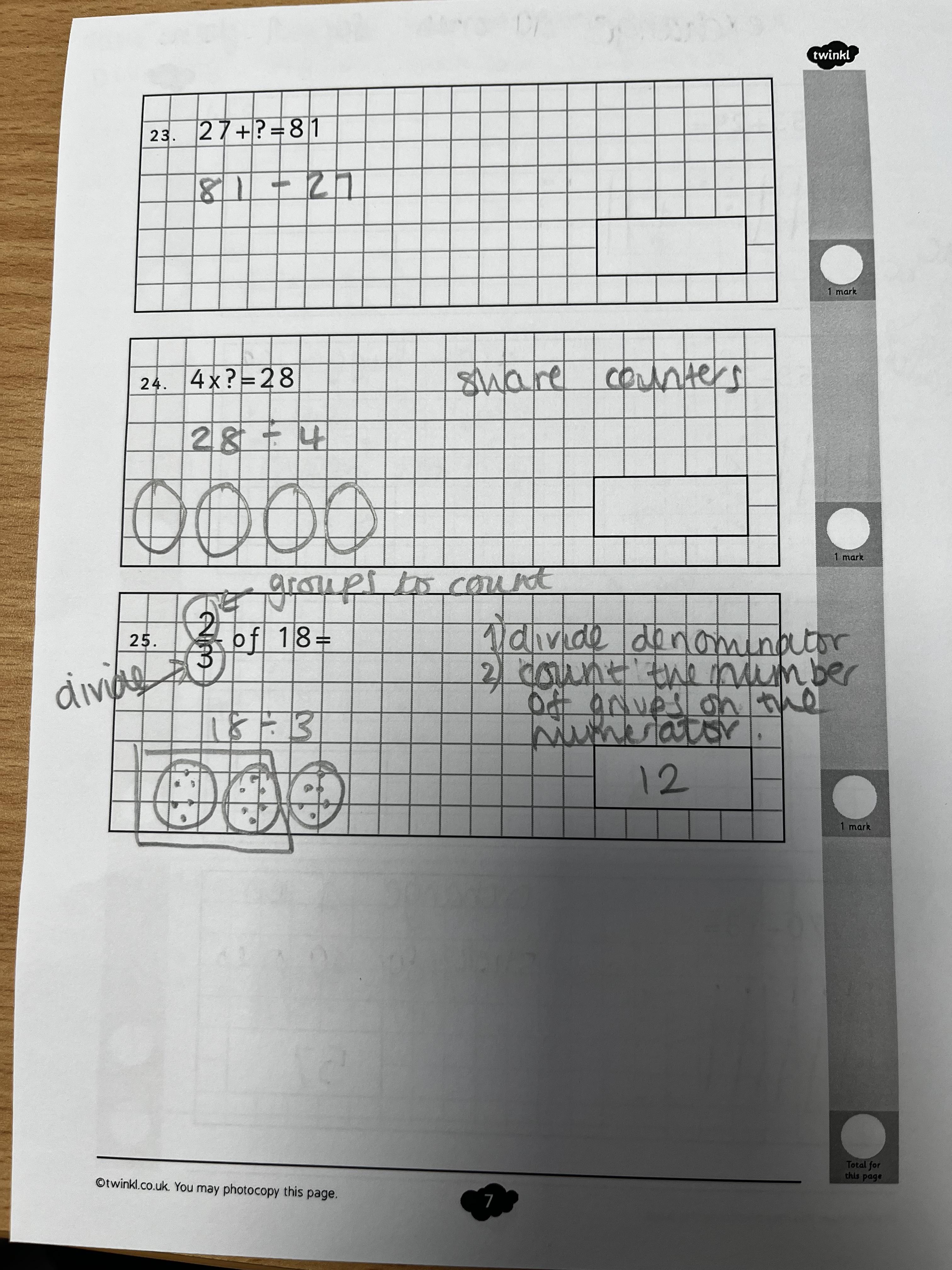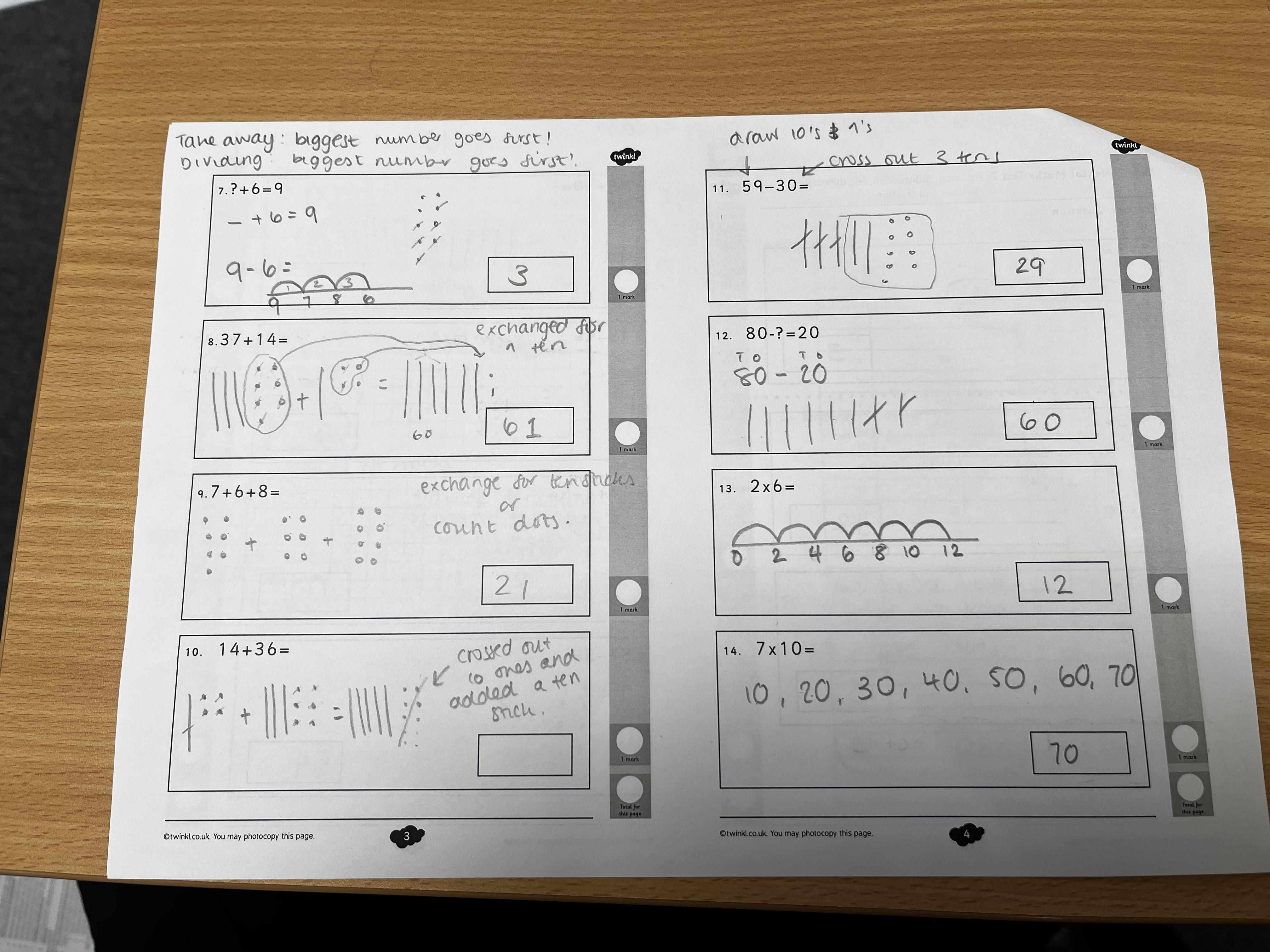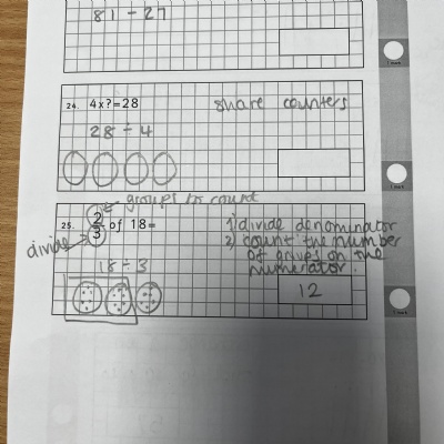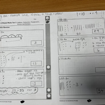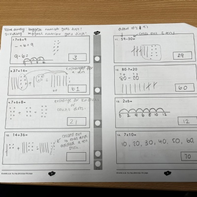 Here are some examples of the working out we encourage the children to show in their maths work. Methods and strategies change frequently from school to school, person to person, time to time so it’s often tricky to know how to support the methods your children are using if you haven’t seen them yourself. Hopefully these examples will give you a rough idea of how work out questions. We always encourage children to show working out so we can understand their understanding and identify how they’ve come to an answer.